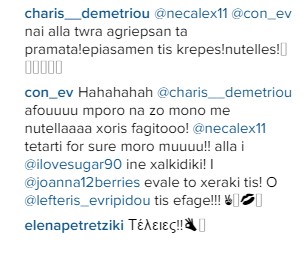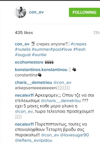 Η όμορφη Κωνσταντίνα Ευριπίδου όπως είναι γνωστό διανύει ήδη τον πέμπτο μήνα εγκυμοσύνης της. Μέσα από τους λογαριασμούς στας social media η μέλλουσα μαμά μας έδειξε ότι αυτούς τους μήνες επιτρέπει στον εαυτό της κάποιες διατροφικές "ατασθαλίες" αφού είναι μία περιόδος που η γυναίκα επιθυμεί να απολαμβάνει την κάθε στιγμή της. Εντούτοις η Κώνσταντίνα είναι από τις τυχερές γιατί παρόλο που έχει ξεφύγει λίγο από τη διατροφή της η ίδια καταφέρνει να διατηρεί μία αξιοζήλευτη σιλουέτα για μία γυναίκα που βρίσκεται στο πέμπτο μήνα της εγκυμοσύνης της. Χθες βράδυ η ίδια απόλαυσε ακόμη ένα γλυκό πειρασμό και το αποκάλυψε με μία φωτογραφία που ανέβασε στο instagram. Αμέσως οι φίλοι της αλλά και ο σύζυγός της, ο οποίος βρίσκεται στο Καζακσταν για τις αθλητικές υποχρεώσεις του ΑΠΟΕΛ, σχολιάσαν το γεγονός. ΔΙαβάστε το διάλογό τους: