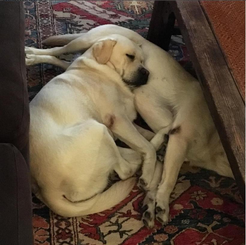 Τα Labrador της, όπως τα αποκαλεί και η ίδια Dboys, ήταν κουρασμένα και είχαν αποκοιμηθεί αγκαλιά στο σαλόνι του σπιτιού της. Όντας και η ίδια κουρασμένη έγραψε: "Μόλις μπήκα σπίτι ! Τελικά δεν είμαι μόνο εγώ πτώμα από τη δουλειά!" Οι followers της ενθουσιάστηκαν με την φωτογραφία και όπως ήταν φυσικό τα likes και τα σχόλια έπεσαν βροχή.