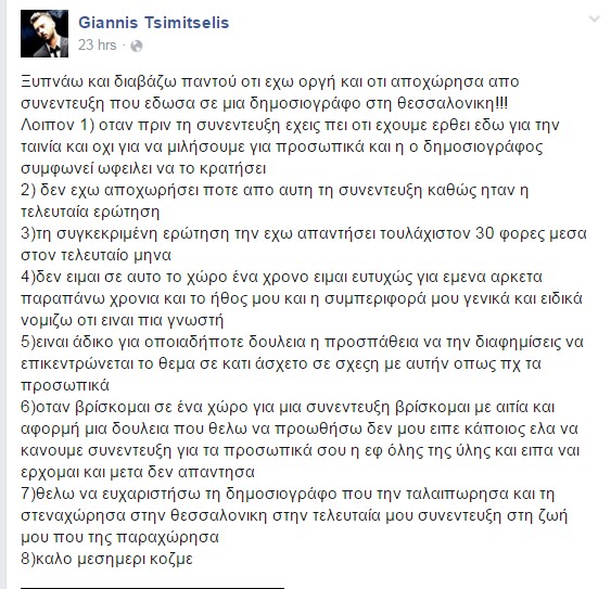 "Ξυπνάω και διαβάζω παντού ότι έχω οργή και ότι αποχώρησα από συνέντευξη που έδωσα σε μια δημοσιογράφο στη Θεσσαλονίκη!!!
