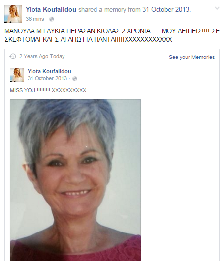Η παρουσιάστρια με αφορμή τη συμπλήρωση δύο χρόνων από το θάνατο της μητέρας της, Αργυρώς, έγραψε στο facebook: “Μανούλα μου γλυκιά, πέρασαν κιόλας δύο χρόνια… Μου λείπεις… Σε σκέφτομαι και σε αγαπώ για πάντα”, αναρτώντας μάλιστα μία φωτογραφία της.