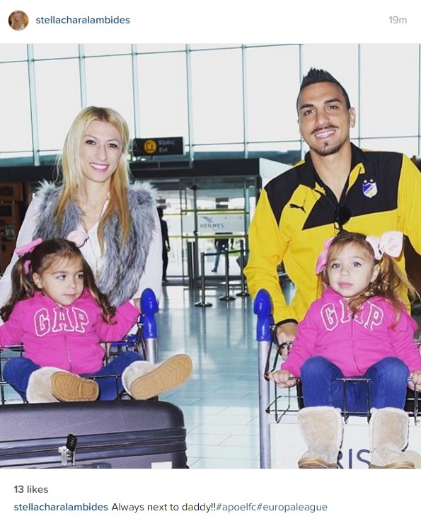 Αύριο στις 21:00 ο ΑΠΟΕΛ δίνει ένα σημαντικό αγώνα με τον Αστέρα στην Τρίπολη για την 4η αγωνιστική του 11ου ομίλου του Europa League. Οι ποδοσφαιριστές αναχώρησαν από την Κύπρο σήμερα στις 09:00 για την Καλαμάτα και αργότερα θα κατευθυνθούν για την Τρίπολη. Ο Κωνσταντίνος Χαραλαμπίδης σε αυτή την αποστολή έχει μαζί του και τις γυναίκες της ζωής του τη σύζυγό του Στέλλα και τις δίδυμες κορούλες τους Φένια και Νέλια. Μάλιστα η Στέλλα ανέβασε πρωί πρωί στον προσωπικό της λογαριασμό στο instagram την πιο κάτω φωτογραφία που δείχνει την οικογένεια Χαραλαμπίδη στο αεροδρόμιο με τη λεζάντα που τη συνόδευε να γράφει "Πάντα δίπλα στον μπαμπά". Να ευχηθούμε στον ΑΠΟΕΛ καλή επιτυχία.