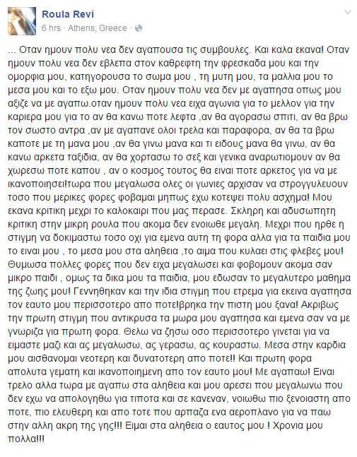 Γενέθλια έχει σήμερα η φωτογράφος, Ρούλα Ρέβη και θέλησε να ευχηθεί στον εαυτό της, κάνοντας ένα συγκινητικό απολογισμό με μία μακροσκελή ανάρτηση στον προσωπικό της λογαριασμό στο facebook.