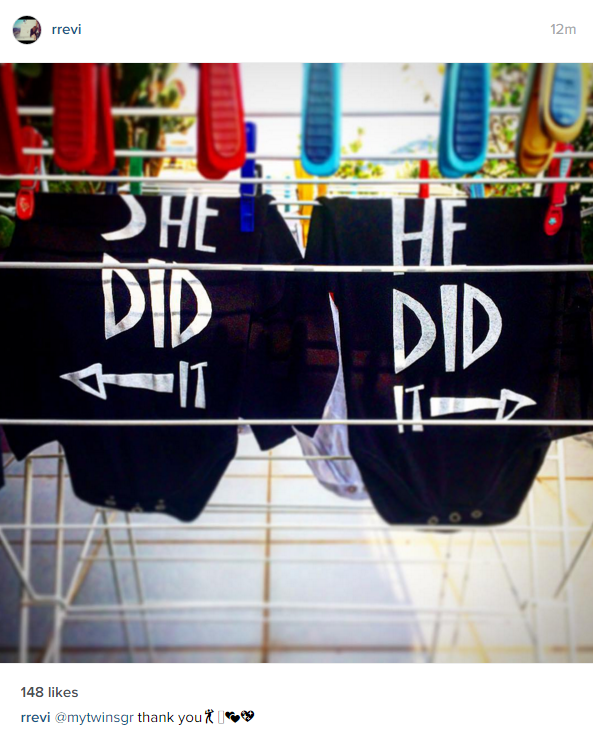 Ένα δωράκι που ενθουσίασε τη φωτογράφο έλαβε σήμερα. Πρόκειται για δύο παιδικά φορμάκια, ένα για το αγοράκι και ένα για το κοριτσάκι της, τα οποία η ίδια ανήρτησε στον προσωπικό της λογαριασμό στο instagram, ευχαριστώντας τον αποστολέα τους.