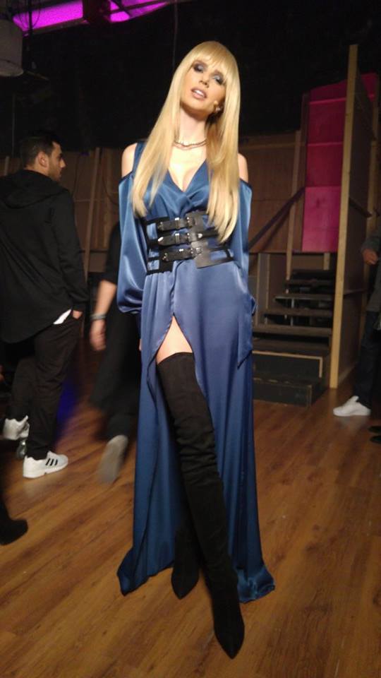 Ο Κύπριος σχεδιαστής, Gregory Morfi έχει δημιουργήσει το φόρεμα που φοράει απόψε η παρουσιάστρια ενώ η ζώνη είναι από την First boutique.