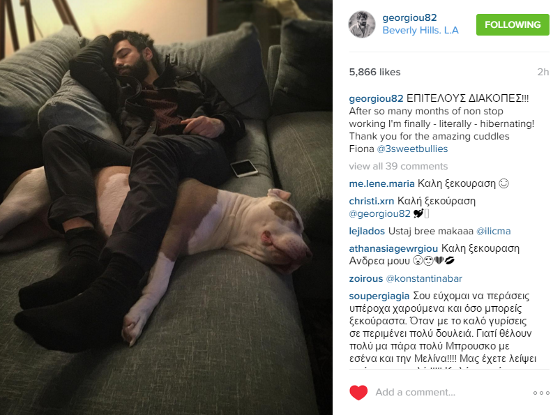 Ο ίδιος αναρτώντας μία φωτογραφία στον προσωπικό του λογαριασμό στο instagram, όπου απεικονίζεται να κοιμάται μαζί με ένα σκύλο, έγραψε στη λεζάντα που συνόδευσε τη φωτογραφία: “Επιτέλους διακοπές μετά από τόσους μήνες ασταμάτητης δουλειάς…”