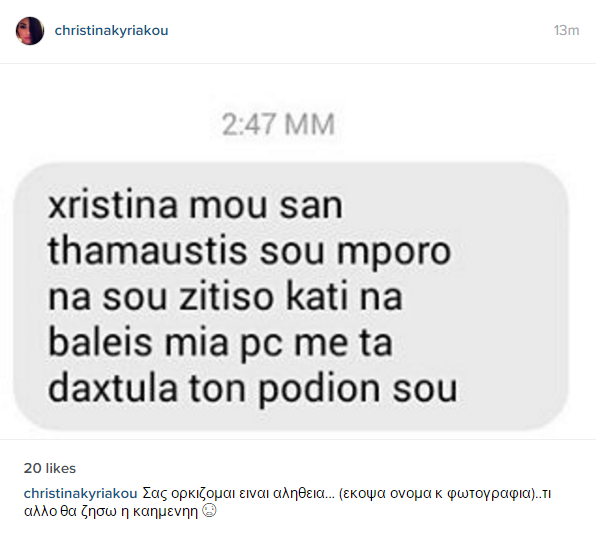 Άφωνη έμεινε η Χριστίνα Κυριάκου, όταν έλαβε μήνυμα από κάποιον θαυμαστή της, ο οποίος της ζήτησε να ποστάρει φωτογραφία στα social media, όπου θα απεικονίζονται… τα δάκτυλα των ποδιών της.