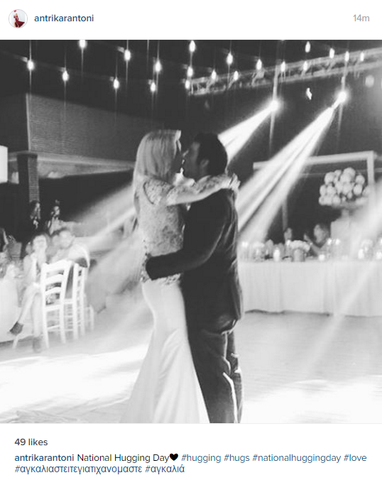 Ημέρα αγκαλιάς σήμερα Πέμπτη και η Άντρη Καραντώνη πόσταρε στα social media της μια τρυφερή εικόνα από τον γάμο της την στιγμή του γαμήλιου χορού της με τον σύζυγο της Νεοκλή Σκουρουμούνη. Μάλιστα έστειλε και το δικό της μήνυμα “Αγκαλιαστείτε γιατί χανόμαστε". Η παρουσιάστρια-ραδιοφωνική παραγωγός του Super Fm σε κάθε ευκαιρία βρίσκει τρόπο να εκφράζει τον έρωτα της στον Νεοκλή Σκουρουμούνη που είναι ο άνδρας της ζωής της.