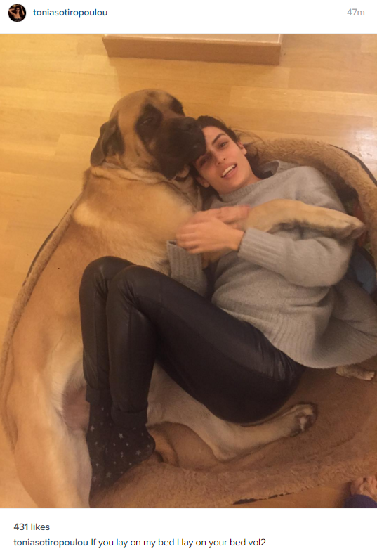 Εκτός από την προσωπική της ζωή, αρκετά γνωστή είναι και η αγάπη της για τα ζώα και η δράση της όσον αφορά στην προστασία τους. Η ηθοποιός, με μία παιχνιδιάρικη διάθεση, ξάπλωσε στο κρεβάτι του σκύλου, κρατώντας τον αγκαλιά.