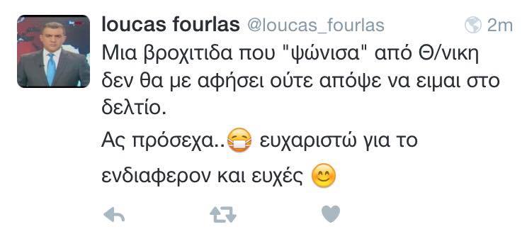 Επιδημία κρυολογήματος σαρώνει τα κυπριακά μέσα καθώς μετά τους Νικήτα Κυριάκου και Βασιλική Χατζηαδάμου του ΣΙΓΜΑ που σήμερα δεν παρουσίασαν τις εκπομπές τους μιας και οι ιώσεις που τους ταλαιπωρούν τους κράτησαν στο σπίτι και ο Λουκάς Φουρλά δεν θα βρίσκεται σήμερα στην παρουσίαση του κεντρικού δελτίου του Mega αφού όπως ενημέρωσε τους διαδικτυακούς του φίλους μία βρογχίτιδα που τον ταλαιπωρεί δεν του επιτρέπει απόψε να βρίσκεται στο σταθμό. Περαστικά στον παρουσιαστή από την ομάδα του ilovestylecom