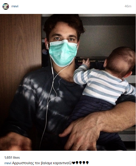 Μία φωτογραφία του συζύγου της, Αποστόλη Τότσικα, ανήρτησε στον προσωπικό της λογαριασμό στο instagram η Ρούλα Ρέβη με τον ηθοποιό να έχει στην αγκαλιά του, τον γιο τους, φορώντας μία μάσκα.