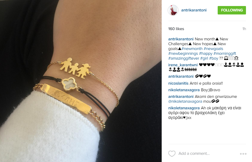 Η ίδια, λίγες μέρες αργότερα μέσα από τον προσωπικό της λογαριασμό στο instagram, φαίνεται να επιβεβαιώνει για πρώτη φορά την εγκυμοσύνη, αναρτώντας μία φωτογραφία, όπου απεικονίζει ένα βραχιολάκι που φοράει, το οποίο συμβολίζει μία οικογένεια με ένα παιδάκι. Αρκετοί ήταν οι διαδικτυακοί της φίλοι, οι οποίοι έσπευσαν να αφήσουν σχόλια, με την ίδια να επισημαίνει πως δεν γνωρίζει ακόμη το φύλο του μωρού.