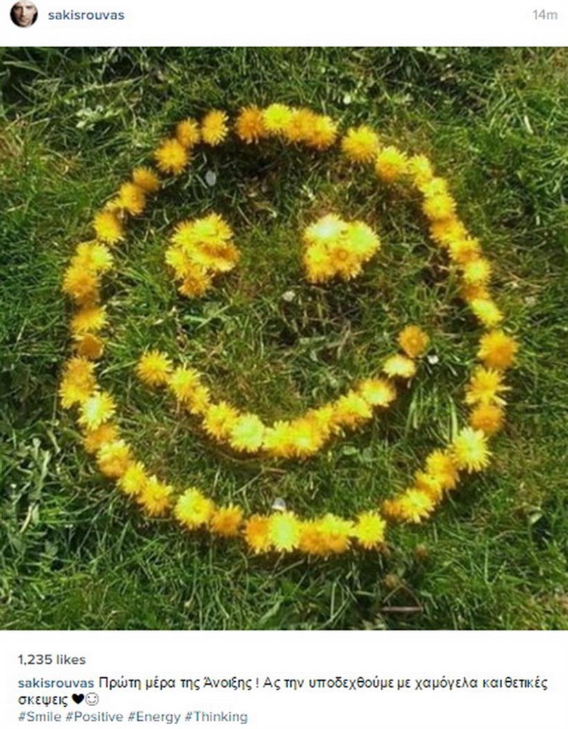Το απόγευμα της Κυριακής 20 Μαρτίου, ο Σάκης Ρουβάς θέλησε να μοιραστεί μια φωτογραφία με τους διαδικτυακούς του φίλους, μέσα από το προσωπικό του προφίλ στο instagram. O τραγουδιστής, που ζει την απόλυτη ευτυχία, καθώς έχει αποκτήσει ήδη 3 παιδιά και με τη σύντροφο του Κάτια Ζυγούλη περιμένουν σε λιγότερο από ένα μήνα, τον ερχομό του 4ου, ανέβασε μια εικόνα με μια χαρούμενη φατσούλα, φτιαχμένη από λουλούδια, πάνω στο γρασίδι. Ο ίδιος άλλωστε είχε δηλώσει στο περιοδικό "ΕΓΩ!Weekly", για τον ερχομό του 4ου μέλους της οικογένειας: "Είμαστε ευτυχισμένοι, περιμένουμε με χαρά το παιδί μας". Έτσι λοιπόν, μεσα από μια φωτογραφία όλο νόημα, καθώς μέσα στην Άνοιξη πρόκειται να γεννήσει η Κάτια Ζυγούλη, σχολίασε από κάτω: «Πρώτη μέρα της Άνοιξης ! Ας την υποδεχθούμε με χαμόγελα και θετικές σκέψεις ".
