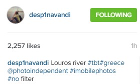 Η Δέσποινα Βανδή, μέσα από τον προσωπικό της λογαριασμό στο instagram, το πρωί της Τετάρτης 23 Μαρτίου, ανέβασε μια φωτογραφία, από ένα πολύ μαγευτικό τοπίο, στην Πρέβεζα και συγκεκριμένα από τον ποταμό Λούρο. Το υπέροχο τοπίο, ενθουσίασε αμέσως τους διαδικτυακούς της φίλους που έσπευσαν να το σχολιάσουν! Η τραγουδίστρια, φρόντισε να κάνει μια μικρή απόδραση, απολαμβάνοντας τη φύση, μακριά από τις υποχρεώσεις της καθημερινότητας, ενώ στη λεζάντα της ανάρτησής της, έγραψε "Λούρος ποταμός, Ελλάδα, κανένα φίλτρο".