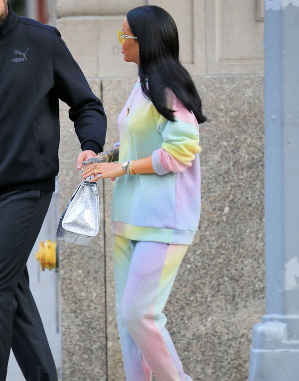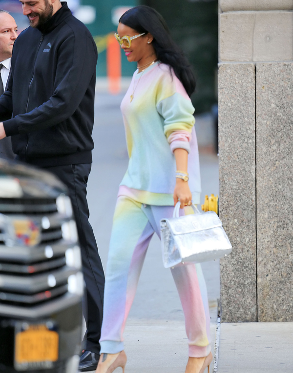 Με φόρμες γυμναστικής σε pastel χρωματισμούς συνδυασμένες με γόβες εντόπισε ο φωτογραφικός φακός τη RIhanna τη στιγμή που η ίδια αποχωρούσε από το ξενοδοχείο που διέμενε στη Νέα Υόρκη.