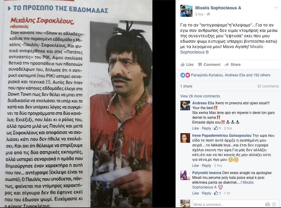 Οι συνάδελφοι του ενοχλήθηκαν και λίγες μέρες μετά ένα δημοσίευμα σε κυπριακό περιοδικό τον χαρακτήρισε ότι 'έφτυνε' εκεί που του έδωσαν ψωμί αλλά και πολλά άλλα σκληρά λόγια. Ο ίδιος αφού πόστερ το δημοσίευμα έγραψε: "Για το αν 'αντιγράψαμε' ή 'κλέψαμε'... Για το αν εγώ σαν άνθρωπος δεν είμαι ντόμπρος και μέσω της συνέντευξης μου 'έφτυσα' εκεί που μου έδωσαν ψωμί ευτυχώς υπάρχει βίντεο (πιο κάτω) με τα λεγόμενα μου! Μόνο Αγάπη!".