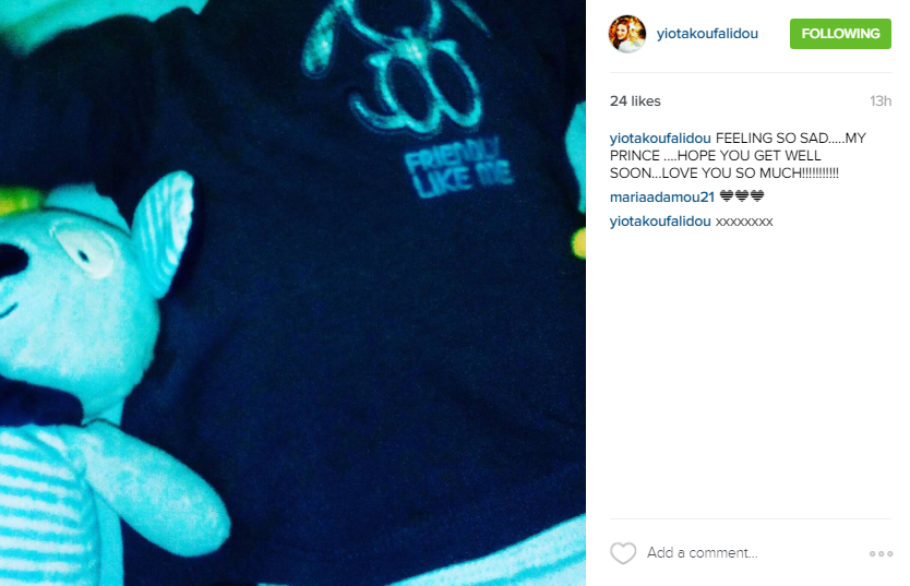 Μάλιστα, η παρουσιάστρια ανήρτησε μία φωτογραφία στον προσωπικό της λογαριασμό στο instagram, καθώς θέλησε να το μοιραστεί με τους διαδικτυακούς της φίλους, όπου απεικονίζεται ο γιος της να ξαπλώνει και έγραψε στη λεζάντα που τη συνόδευσε: “Είμαι στεναχωρημένη… ο πρίγκιπάς μου… Ελπίζω να γίνεις καλά σύντομα… Σε αγαπώ πολύ”.