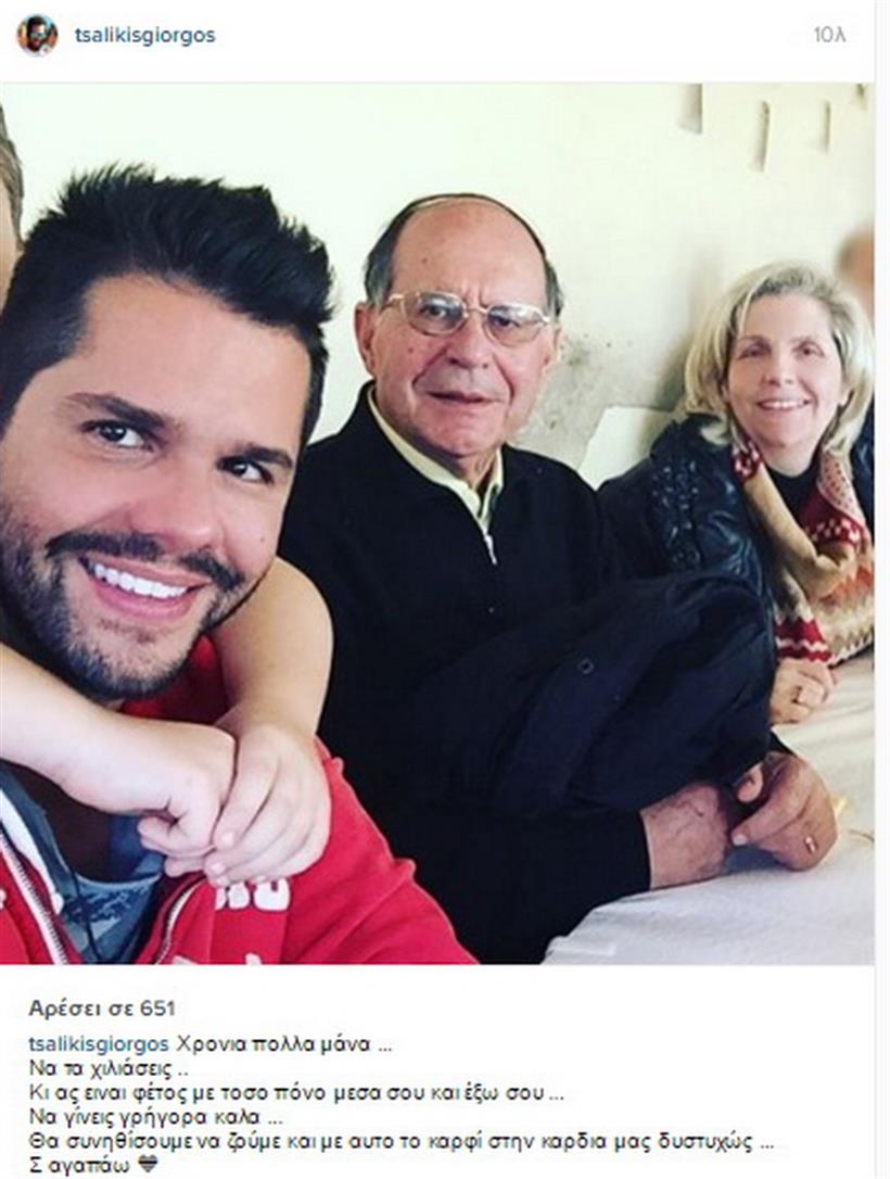 "Χρόνια πολλά μάνα. Να τα χιλιάσεις. Κι ας είναι φέτος με τόσο πόνο μέσα σου και έξω σου. Να γίνεις γρήγορα καλά. Θα συνηθίσουμε να ζούμε και με αυτό το καρφί στην καρδιά μας δυστυχώς. Σε αγαπάω" έγραψε ο Γιώργος Τσαλίκης στον προσωπικό του λογαριασμό στο Ιnstagram. Ο Γιώργος Τσαλίκης προσπαθεί να διαχειριστεί την απώλεια της θείας του και την σοβαρή κατάσταση στην οποία νοσηλεύεται η μητέρα του με δύναμη ψυχής. Ο Γιώργος Τσαλίκης δημοσίευσε την φωτογραφία το πρωί του Σαββάτου 2 Απριλίου θέλοντας με τον τρόπο του να μοιραστεί τις σκέψεις του και τον πόνο που βιώνει από το αναπάντεχο χτύπημα στην οικογένεια, μέσα από ευχές για την αγαπημένη του μητέρα.
