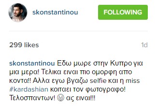 Φυσικά πρόκειται για μία χιουμοριστική φωτογραφία που ανέβασε στον προσωπικό του λογαριασμό στο instagram ο Σταύρος Κωνσταντίνου. Ο Κύπριος τραγουδιστής στη λεζάντα που συνόδευε τη φωτογραφία ανέφερε ότι η Kim ήρθε στην Κύπρο για μία μέρα και ότι είναι πιο όμορφη από κόντά. Βέβαια δεν παρέλειψε να σχολιάσει ότι η διάσημη star δεν σταμάτησε να κοιτάζει στιγμή το φωτογραφικό φακό.