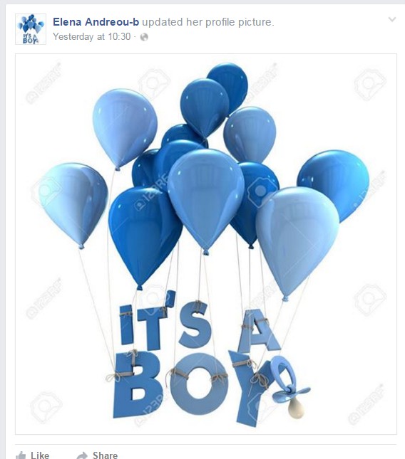"Είμαι η πιο χαρούμενη μαμά στον κόσμο. Νιώθω ευλογημένη" έλεγε σε όλους. Η επώνυμη Κύπρια που έγινε μαμά πριν μερικές ώρες αποκτώντας ένα υπέροχο αγοράκι ζει την απόλυτη ευτυχία. Αυτό είναι το πρώτο παιδί της οικογένειας της και μαζί με τον σύντροφο της είναι απόλυτα χαρούμενοι μιας και ολοκλήρωσαν την ευτυχία τους. Η τραγουδίστρια δέχεται ασταμάτητα βροχή απο μηνύματα στους λογαριασμούς της στο διαδίκτυο αλλά και στο κινητό της τηλέφωνο. Μάλιστα η τραγουδίστρια Έλενα Ανδρέου, για την οποία ο λόγος, ενημέρωσε του διαδικτυακούς της φίλους για τον ερχομό του γιου της αλλάζοντας στο facebook τη φωτογραφία του προφίλ της.