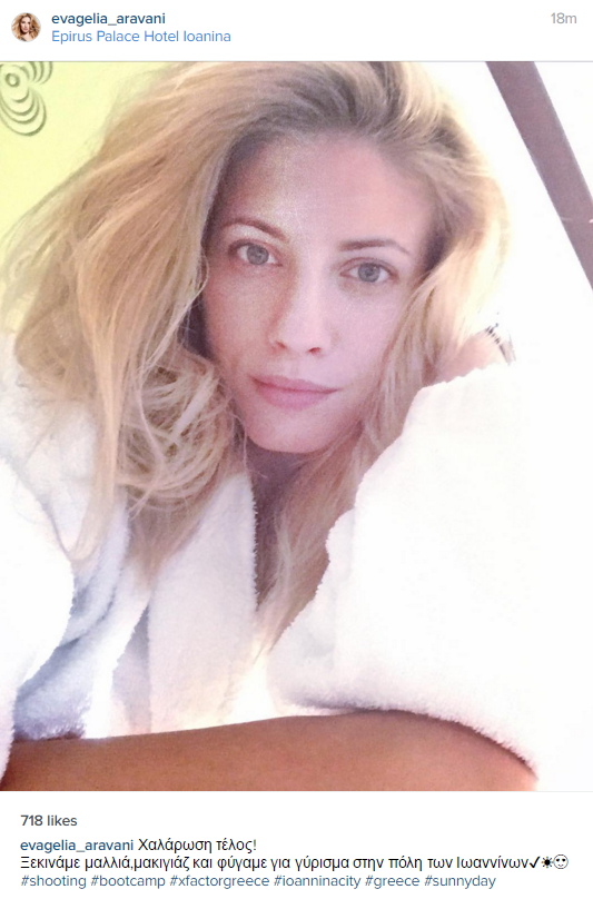 Η Ευαγγελία Αραβανή και η ομάδα του talent show ταξίδεψαν στα Ιωάννινα για γυρίσματα, όπου θα διεξαχθεί η συγκεκριμένη φάση και η νεαρή παρουσιάστρια, ανήρτησε μία φωτογραφία στον προσωπικό της λογαριασμό στο instagram, όπου ποζάρει με το μπουρνούζι και άβαφη, λίγο πριν ξεκινήσει τις ετοιμασίες για τα γυρίσματα.
