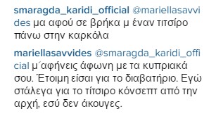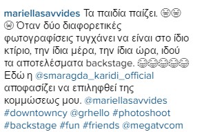 Φωτογραφήσεις για δυο διαφορετικά περιοδικά έκαναν το απόγευμα της Τρίτης η Κύπρια ηθοποιός Μαριέλλα Σαββίδη και η Σμαράγδα Καρύδη. Όταν τα δυο κορίτσια συναντήθηκαν τυχαία στον χώρο ακολούθησε ξεμάλλιασμα της Σμαράγδας στην Μαριέλλα. "Τα παιδία παίζει. Όταν δύο διαφορετικές φωτογραφίσεις τυγχάνει να είναι στο ίδιο κτίριο, την ίδια μέρα, την ίδια ώρα, ιδού τα αποτελέσματα backstage" μας έγραψε στο instagram και πόσταρε την τρελή φωτογραφία που βλέπετε. Μάλιστα η Σαμράγδα Καρύδη σχολιάσε τη φωτογραφία λέγοντας μας το λόγο που της "επιτέθηκε" στη φωτογράφηφη: