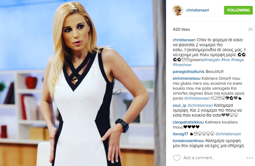 Η ίδια μέσα από μία ανάρτηση στον προσωπικό της λογαριασμό στο instagram, απαντάει εμμέσως σε όλους εκείνους που τη θέλουν έγκυο. Η παρουσιάστρια πόσταρε μία φωτογραφία της με στενό φόρεμα, γράφοντας μάλιστα στη λεζάντα που τη συνόδευσε: “Όταν το φόρεμα σε κάνει να φαίνεσαι 2 νούμερα πιο κάτω! Καλημερούδια σε όλους μας! Να έχουμε μια πολύ όμορφη μέρα…”