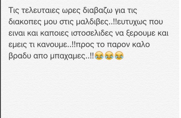 Χθες κάποια site έγραψαν για τις διακοπές που κάνει η παρουσιάστρια στις Μαλβίδες, γεγονός αναληθές και με ένα post στο instagram ενημέρωσε τους διαδικτυακούς της φίλους ότι κάτι τέτοιο δεν ισχύει.