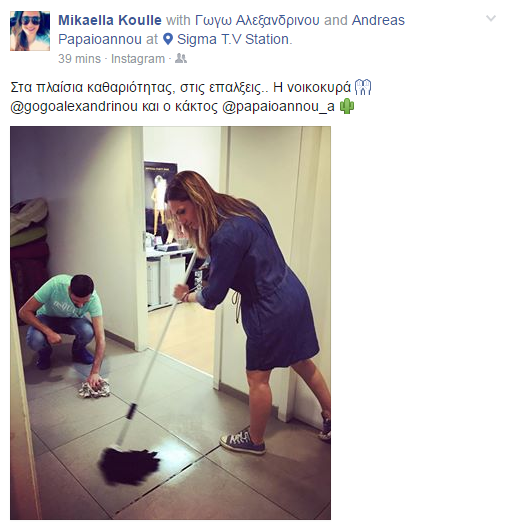 Τη φωτογραφία πόσταρε συνεργάτιδα της εκπομπής γράφοντας στη λεζάντα, που τη συνόδευσε χαριτολογώντας: “Στα πλαίσια καθαριότητας, στις επάλξεις... Η νοικοκυρά Γωγώ Αλεξανδρινού και ο κάκτος Ανδρέας Παπαϊωάννου”.