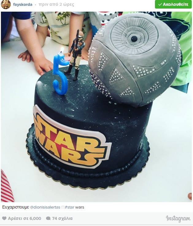 Χθες ήταν μια πολύ σημαντική μέρα για τον Γιώργο Λιάγκα και τη Φαίη Σκορδά. Ο μεγάλος τους γιος, Γιαννάκης είχε γενέθλια, έγινε 5 χρονών. Παρά το δυσάρεστο γεγονός της απώλειας του πατέρα του παρουσιαστή, οι δυο τους κάνουν οτι μπορούν για να ευχαριστήσουν το γιο τους. Έτσι, γιόρτασαν τα γενέθλια του Γιαννάκη με ένα πάρτυ και μια τούρτα υπερπαραγωγή! Η Φαίη πόσταρε στο λογαριασμό της στο instagram την φωτογραφία από το πάρτυ με την τούρτα που είχε θέμα την ταινία Star Wars και ευχαρίστησε το Διονύση Αλέρτα για την παρασκευή της.