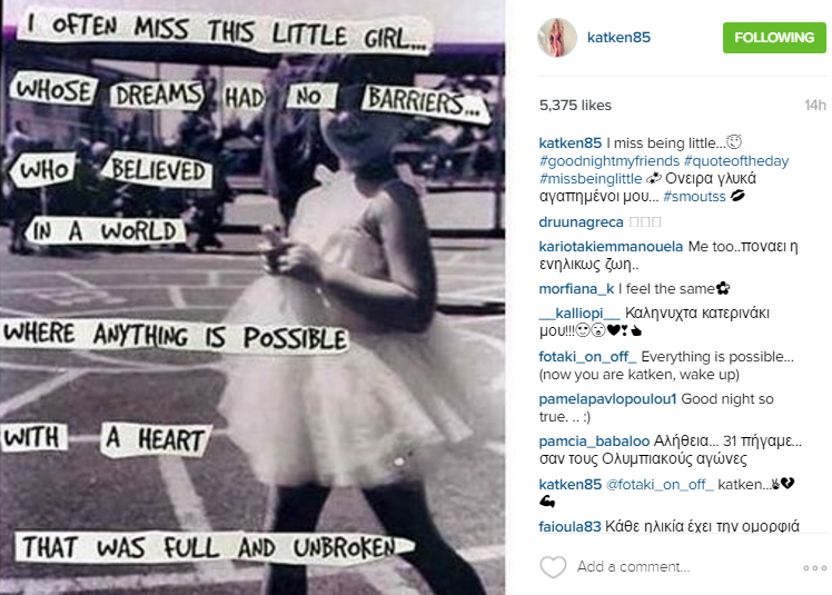Η παρουσιάστρια, μας έχει συνηθίσει να μιλάει ανοικτά για τα προσωπικά της ζητήματα και αρκετές είναι οι φορές που επιλέγει τα social media προκειμένου να εκφραστεί. Η ίδια καληνύχτισε τους διαδικτυακούς της φίλους με μία φωτογραφία, όπου αναφέρει πως της λείπει η παιδική της ηλικία με εμφανή τη νοσταλγία στα λόγια της.