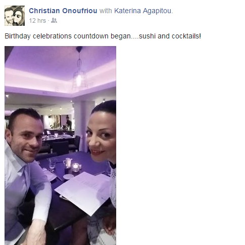 Ο Κωνσταντίνος Χριστοφόρου και η Κατερίνα Αγαπητού γιόρτασαν τα γενέθλιά τους. Ο Κύπριος τραγουδιστής, ο οποίος γεννήθηκε στις 25 Απριλίου, τα γιόρτασε στην Αθήνα όπου ζει και εργάζεται τα τελευταία χρόνια ενώ και η Κατερίνα Αγαπητού, η οποία γεννήθηκε στις 26 Απριλίου, απόλαυσε το βράδυ της Δευτέρας ένα ρομαντικό δείπνο με τον σύζυγο της Κρίστιαν Ονουφρίου.