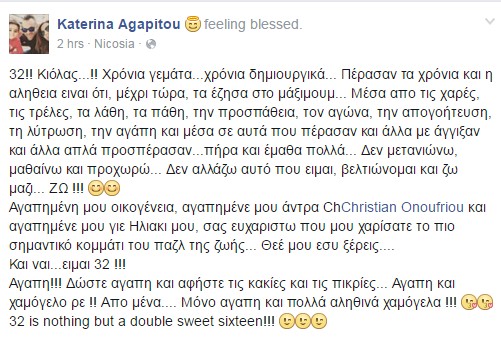 "32!! Κιόλας...!! Χρόνια γεμάτα...χρόνια δημιουργικά... Πέρασαν τα χρόνια και η αληθεια ειναι ότι, μέχρι τώρα, τα έζησα στο μάξιμουμ... Μέσα απο τις χαρές, τις τρέλες, τα λάθη, τα πάθη, την προσπάθεια, τον αγώνα, την απογοήτευση, τη λύτρωση, την αγάπη και μέσα σε αυτά που πέρασαν και άλλα με άγγιξαν και άλλα απλά προσπέρασαν...πήρα και έμαθα πολλά... Δεν μετανιώνω, μαθαίνω και προχωρώ... Δεν αλλάζω αυτό που ειμαι, βελτιώνομαι και ζω μαζι... ΖΩ !!! Αγαπημένη μου οικογένεια, αγαπημένε μου άντρα Kρίστιαν Ονουφρίου και αγαπημένε μου γιε Ηλιακι μου, σας ευχαριστω που μου χαρίσατε το πιο σημαντικό κομμάτι του παζλ της ζωής... Θεέ μου εσυ ξέρεις.... Και ναι...ειμαι 32 !!! Αγαπη!!! Δώστε αγαπη και αφήστε τις κακίες και τις πικρίες... Αγαπη και χαμόγελο ρε !! Απο μένα.... Μόνο αγαπη και πολλά αληθινά χαμόγελα !!! 32 is nothing but a double sweet sixteen!!!" έγραψε η Κατερίνα που έγινε 32