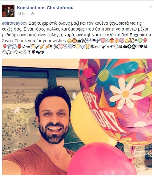 "Σας ευχαριστώ όλους μαζί και τον καθένα ξεχωριστά για τις ευχές σας. Είναι τόσες πολλές και όμορφες που θα πρέπει να απαντώ μέχρι μεθαύριο και αυτό είναι ευλογία, χαρά, αγάπη! Ναστε καλά παιδιά! Ευχαριστω ξανά" έγραψε στα social media του ο Κωνσταντίνος που έγινε 39