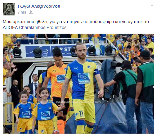 Η παρουσιάστρια, ανήρτησε το σχετικό στιγμιότυπο στο προσωπικό της προφίλ στο facebook, γράφοντας στη λεζάντα που τη συνόδευσε, απευθυνόμενη στο σύζυγό της, Χαράλαμπο Προύντζο: "Μου αρέσει που ήθελες γιό για να πηγαίνετε ποδόσφαιρο και να αγαπάει το ΑΠΟΕΛ".