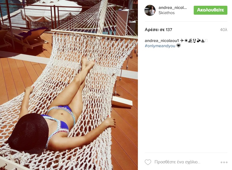 Καλοκαιρινές διακοπές με τον μεγάλο της έρωτα, Κωνσταντίνο Παναγή κάνει η γοητευτική χορεύτρια Άντρεα Νικολάου. Το ερωτευμένο ζευγάρι επέλεξε την Σκιάθο και αυτές τις μέρες χαλαρώνει στις υπέροχες παραλίες του νησιού. Η χορεύτρια και ο τερματοφύλακας αφιερώνουν τον χρόνο τους ο ένας στον άλλο και σέξι όπως πάντα η Άντρεα μοιράστηκε με τους διαδικτυακούς θαυμαστές της μια φωτογραφία με το μπικίνι της ξαπλωμένη σε μια αιώρα.