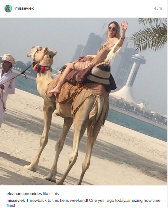 Ο λόγος για την Ήβη Κυπριανού, η οποία το πρωί της Παρασκευής ανήρτησε μία φωτογραφία στον προσωπικό της λογαριασμό στο instagram, όπου απεικονίζεται η ίδια να κάνει βόλτα πάνω σε μία καμήλα, κατά τη διάρκεια της παραμονής της, πέρυσι, στο Abu Dhabi, στο πλαίσιο του hens party της, λίγο πριν από το λαμπερό της γάμο.