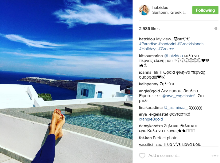 Η εκρηκτική τραγουδίστρια, αναστάτωσε το instagram, καθώς πόσταρε φωτογραφία της, όπου ποζάρει με μικροσκοπικό μπικίνι, έχοντας θέα τα καταγάλανα νερά του Αιγαίου, λαμβάνοντας δεκάδες σχόλια από τους διαδικτυακούς της φίλους.