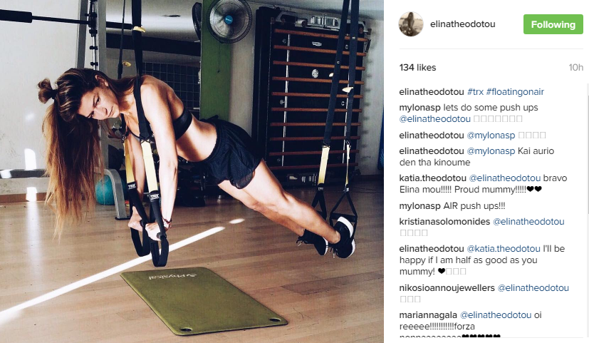 Η ίδια ανήρτησε μία φωτογραφία στον προσωπικό της λογαριασμό στο instagram, όπου απεικονίζεται να κάνει trx, έχοντας τέλεια ισορροπία ενώ διαγράφονται τα καλλίγραμμά της πόδια.