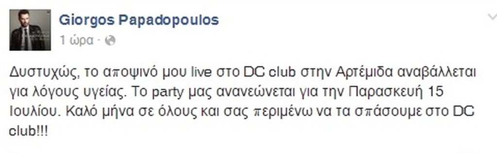 Αλλιώς τα υπολόγιζε και αλλιώς του ήρθαν. Ένα πρόβλημα υγείας ήταν η αιτία να ακυρώσει τις προγραμματισμένες εμφανίσεις του. Ο λόγος για τον Γιώργο Παπαδόπουλο ο οποίος ανακοίνωσε μέσω των social media ότι η εμφάνισή του, σε γνωστό club στην Αρτέμιδα, μεταφέρεται για την Παρασκευή, 15 Ιούλιου.