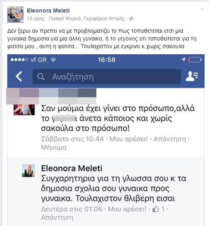 Ένα πράγματι χυδαίο και κακόβουλο σχόλιο από γυναίκα follower της παρουσιάστριας την έκανε να ξεσπάσει. Συγκεκριμένα η παρουσιάστρια έκανε post στο facebook το σχόλιο της διαδικτυακής της "φίλης" και της απάντησε αναλόγως. Η Ελεονώρα έγραψε χαρακτηριστικά: "Δεν ξερω αν πρεπει να με προβληματιζει το πως τοποθετειται ετσι μια γυναικα δημοσια για μια αλλη γυναικα, ή το γεγονος οτι τοποθειτειται για τη φατσα μου , αυτη η φατσα... Τουλαχιστον με εγκρινει κ χωρις σακουλα". Δείτε το σχόλιο της follower και την απάντηση της παρουσιάστριας!
