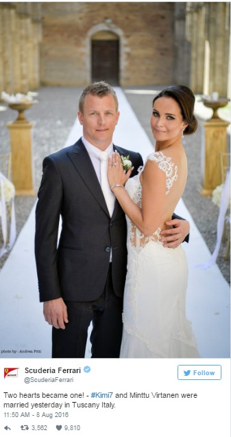 Ενάμιση χρόνο μετά τον ερχομό του γιου τους, έκαναν τον λαμπερό γάμο τους! Ο λόγος για τον παγκόσμιο πρωταθλητή το 2007 της "Formula 1" Kimi Raikkonen και το γνωστό μοντέλο, Minttu Virtanen που παντρεύτηκαν στην Ιταλία, στο αβαείο του San Galgano, ένα μοναστήρι στην Τοσκάνη. Η νύφη φορούσε ένα εντυπωσιακό νυφικό με δαντέλα και ο γαμπρός έδειχνε πολύ κομψός και κρατούσε στην αγκαλιά του τον γιο τους!