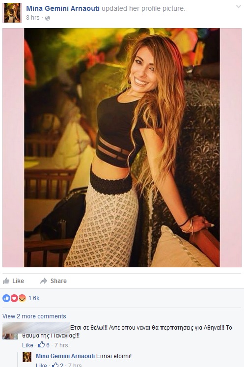 Γεμάτη αισιοδοξία και με άλλη διάθεση είναι η Μίνα Αρναούτη. Το 30χρονο κορίτσι, που βρισκόταν μέσα στο μοιραίο τζιπ που στοίχισε τη ζωή στον Παντελή Παντελίδη και νοσηλεύτηκε για πέντε σχεδόν μήνες στον Ευαγγελισμό, ξεπερνά σιγά σιγά τις δύσκολες ώρες που έζησε, έχοντας στο πλευρό της την οικογένεια και τα αγαπημένα της πρόσωπα. Βρίσκεται ακόμα στη Μυτιλήνη όπου και αναρρώνει με αργά αλλά σταθερά βήματα. Η Μίνα κάνει τις φυσιοθεραπείες της και φαίνεται πως είναι πολύ κοντά στο να περπατήσει. Τουλάχιστον έτσι έγραψε η ίδια απαντώντας σε σχόλιο φίλης της στη νέα φωτογραφία που ανέβασε στο facebook της.