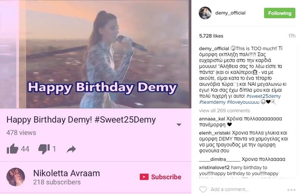 Μάλιστα χθες δημοσίευσε μία έκπληξη που της έκαναν και έγραψε: "This is TOO much!! Τί όμορφη εκπληξη παλι?!?! Σας ευχαριστώ μεσα απο την καρδιά μουυυυ! "Αλήθεια σας το λέω είστε τα πάντα" (και οι καλύτεροι - να με ακούτε, είμαι κατα το ένα τέταρτο αιωνόβια τώρα) και ΝΑΙ μεγαλωνω κι εγω! Και σας έχω δίπλα μου και είμαι πολύ τυχερή γι αυτο! #sweet25demy #teamdemy #iloveyouuuuu"! Δείτε την έκπληξη που της ετοίμασαν!