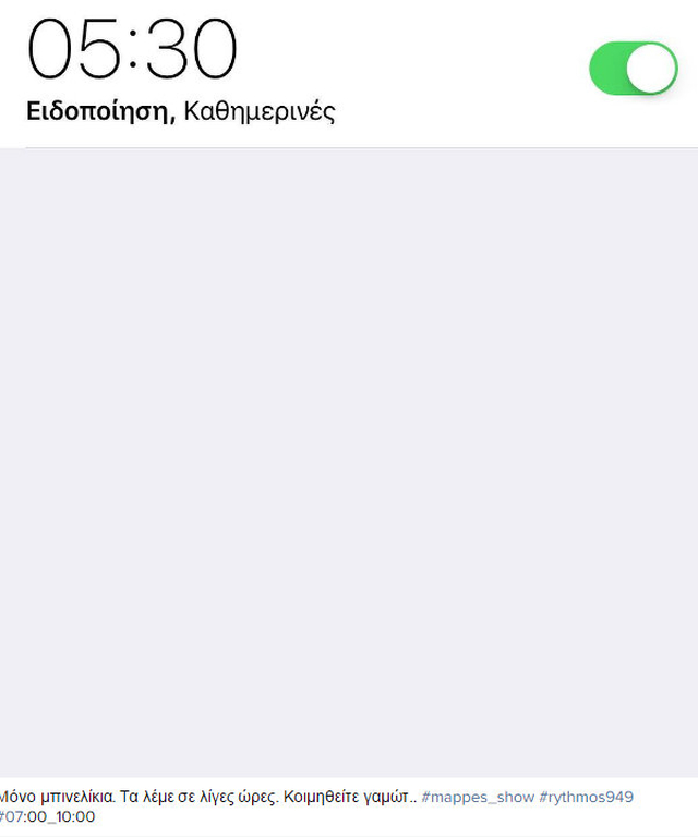 Οι διακοπές τέλος για τον Δημήτρη Ουγγαρέζο που απόλαυσε τα ελληνική νησιά. Τι συνέβη όμως και ο παρουσιαστής το βράδυ της Κυριακής ήταν μέσα στα νεύρα; Μα τι άλλο; Το πολύ πρωινό ξύπνημα αφού από σήμερα το πρωί ξεκίνησε και πάλι η ραδιοφωνική του εκπομπή. "Μόνο μπινελίκια. Τα λέμε σε λίγες ώρες. Κοιμηθείτε γαμώτ..", έγραψε χαρακτηριστικά ποστάροντας μια φωτογραφία με την ώρα που έβαλε να χτυπήσει το ξυπνητήρι του.