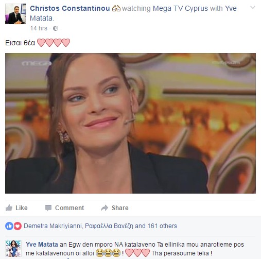 "Αν εγώ δεν μπορώ να καταλαμβαίνω τα ελληνικά μου, αναρωτιέμαι πως με καταλαμβαίνουν οι άλλου… Θα περάσουμε τέλεια" έγραψε η Υβόννη Μπόσνιακ σε σχόλιο που της έκανε ο αρχισυντάκτης των καλλιστείων για την ανάδειξη της Star Κύπρος, Χρήστος Κωνσταντίνου. Το μοντέλο ακομπλεξάριστη καταλαμβαίνει πως δεν μιλάει καλά ελληνικά και τρολάρει τον ίδιο της τον εαυτό. Διαβάστε το διάλογο: