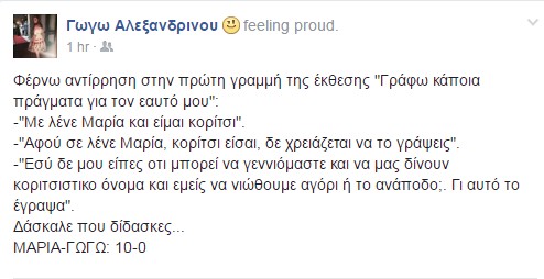 Το διάλογο που είχε με τη μικρή της κόρη Μαρία αποκάλυψε με ένα post της στο προσωπικό τη λογαριασμό στο facebook η παρουσιάστρια της εκπομπής "Μεσημέρι και κάτι", Γωγώ Αλεξανδρινού. Η ίδια όπως έγραψε είχε μια αντίρρηση για την πρώτη γραμμή της έκθεσης που έγραψε η Μαρία με θέμα "Γράφω κάποια πράγματα για τον εαυτό μου". Η απάντηση που έδωσε ωστόσο η κόρη της μαμάς ήταν αποστομωτική κάτι που έκανε τη Γωγώ να αποκαλύψει τη συνομιλία στους διαδικτυακούς της φίλους. Διαβάστε τη στιχομυθία που είχαν: