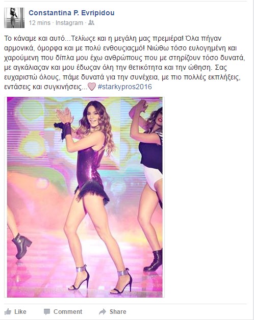 Με ένα μήνυμα στον προσωπικό της λογαριασμό στο facebook η Κωνσταντίνα Ευριπίδου σχολίασε τα όσα συνέβησαν χθες στην πρεμιέρα του διαγωνισμού ομορφιάς “Star Κύπρος 2016” με παρουσιάστρια την ίδια. Η Κωνσταντίνα Ευριπίδου ευχαρίστησε όσους είναι δίπλα της ενώ έδωσε υπόσχεση για πιο πολλές εκπλήξεις, εντάσεις και συγκινήσεις, Διαβάστε το post της.