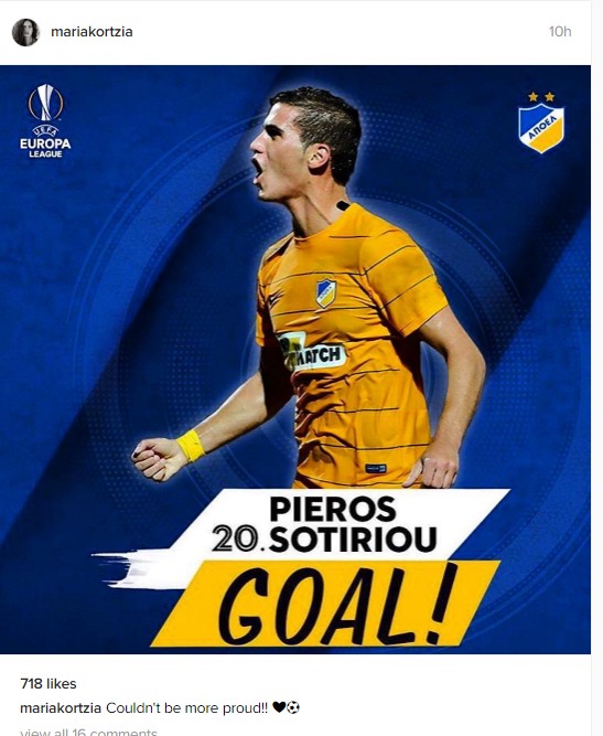 Νικηφόρα πέρασε χθες από το γήπεδο Καραϊσκάκη ο Αποέλ. Με γκολ του Πιέρου Σωτηρίου στο 10ο λεπτό του αγώνα οι πρωταθλητές Κύπρου πήραν του πολυπόθητους δύο βαθμούς κόντρα στον Ολυμπιακό Πειραιώς. Μία από αυτούς που πανηγύρισαν το γκολ και φυσικά τη νική της ομάδας ήταν και η σύντροφος του διεθνή ποδοσφαιριστή. Η Μαρία Κορτζιά λοιπόν ανέβασε στον προσωπικό της λογαριασμό στο ιnstagram μία φωτογραφία του Πιέρου Σωτηρίου, γράφοντας στη λεζάντα: "Δεν θα μπορούσα να είμαι πιο περήφανη".