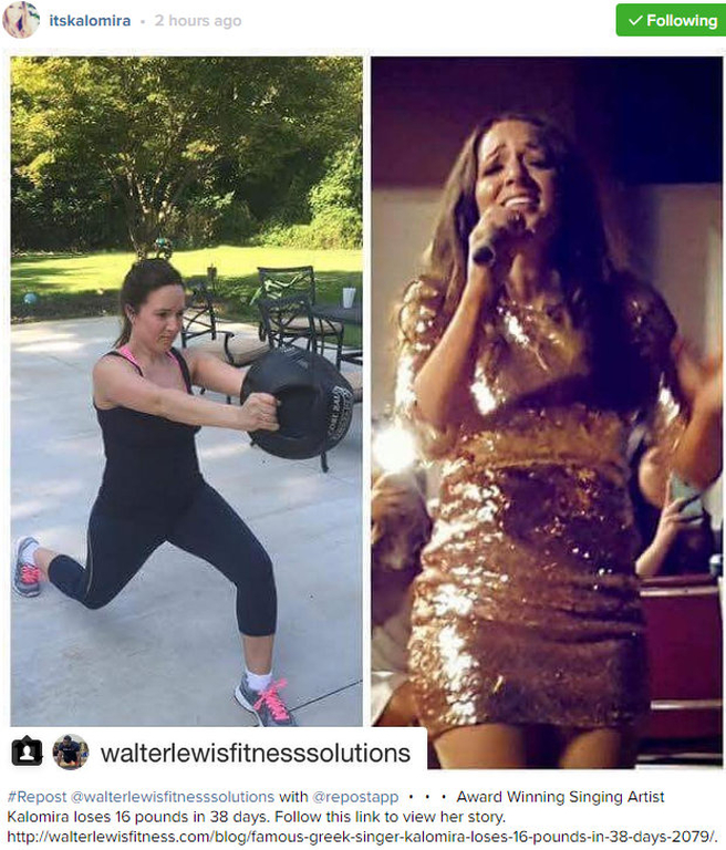 Μπορεί μετά την πρώτη της εγκυμοσύνη να άργησε να χάσει όλα τα κιλά που είχε πάρει όμως αυτή τη φορά το πήρε ακόμη πιο σοβαρά. Ο λόγος για την Καλομοίρα, η οποία κατάφερε μέσα σε μόλις 38 ημέρες να χάσει 7,5 κιλά. Αμέσως μετά τη γέννηση της κόρης της η τραγουδίστρια ξεκίνησε εντατικό πρόγραμμα γυμναστικής με τον personal trainer, Walter Lewis το οποίο συνδύασε με σωστή διατροφή. Την αποκάλυψη έκανε η ίδια μέσα από τη προσωπική της σελίδα στο instagram