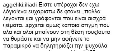 Συγκεκριμένα, έφτιαξε ένα βίντεο collage με φωτογραφίες του Σάββα και των παιδιών της και ανάρτησε στο προφίλ της. Οι διαδικτυακοί της φίλοι έσπευσαν να αφήσουν σχόλια σχετικά με τον χωρισμό της. Η Αγγελική, διαβάζοντας τα θέλησε να απαντήσει σε κάποια από αυτά. Εξάλλου απαντάει συχνά και συνομιλεί με τους θαυμαστές της.
